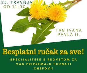 Posjetitelji će moći kušati domaću tjesteninu s regvetom, rižoto i kajganu s maslačkom, salatu s feta sirom i grahom te pesto od maslačka. Sve će se pripremati u velikoj “mega tavi” na samom trgu, stvarajući pravi mali gastronomski spektakl.