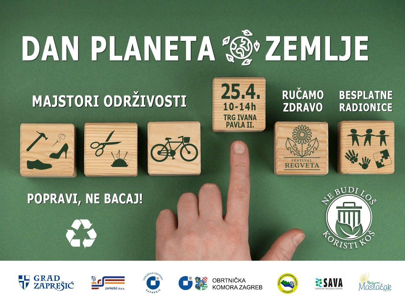 U subotu, 25. travnja, Zaprešić će još jednom pokazati kako lokalna zajednica može biti pokretač pozitivnih promjena. Na Trgu Ivana Pavla II., u vremenu od 10 do 14 sati, održat će se bogat i raznolik program povodom obilježavanja Dana planeta Zemlje, uz snažnu poruku: „I ti činiš razliku!“