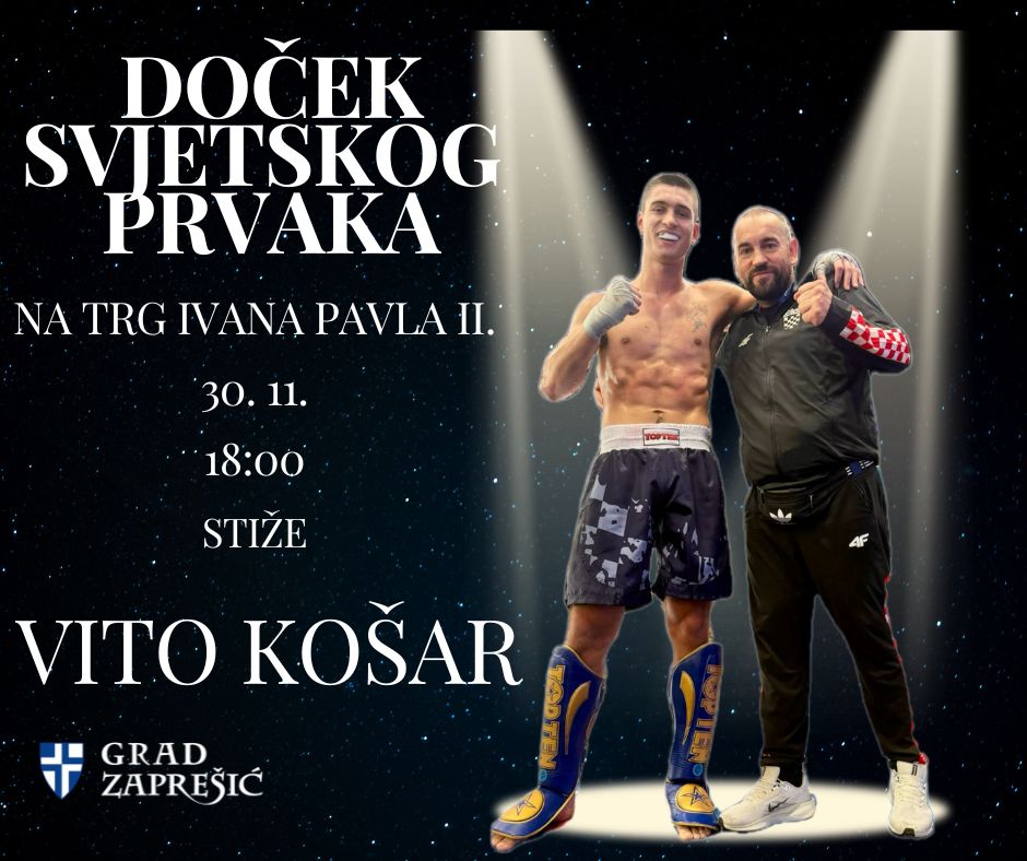 Zaprešić će danas, u nedjelju 30. studenoga, na Trgu Ivana Pavla II svečano dočekati novog svjetskog kickboxing prvaka u disciplini K1 do 86 kilograma – Vitu Košara. Nakon izvanrednog uspjeha i osvajanja zlatne medalje na svjetskom prvenstvu, za svog će se borca večeras u 18:00 sati okupiti sugrađani, prijatelji i cijeli njegov tim.