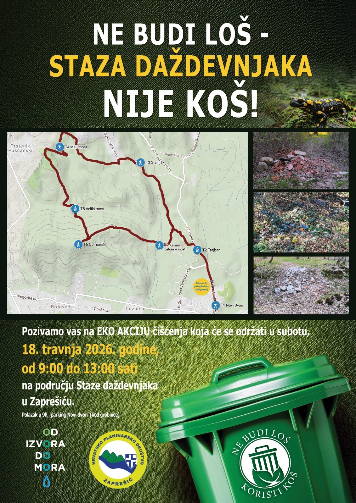Okupljanje sudionika predviđeno je na parkiralištu kod Novih dvora (lovački dom), odakle će započeti organizirano kretanje Stazom daždevnjaka uz prikupljanje otpada.