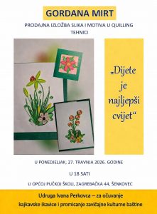 U organizaciji Udruge Ivana Perkovca, u ponedjeljak 27. travnja u 18 sati u prostoru Stare škole u Šenkovcu otvara se humanitarna, prodajna izložba „Dijete je najljepši cvijet“, autorice Gordane Klokočar Mirt.