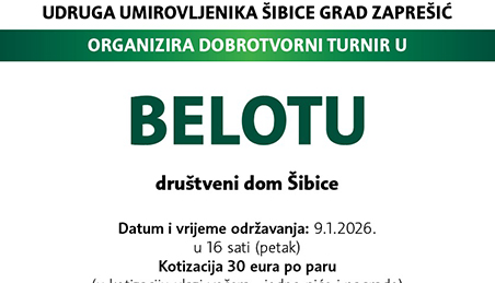 Vođena tom tradicijom i željom da se spoje ugodno i korisno, Udruga umirovljenika Šibice, pod vodstvom predsjednice Mirjane Katarinčić, organizira humanitarni turnir u beli koji će se održati u petak, 9. siječnja, s početkom u 16 sati u Društvenom domu Šibice.