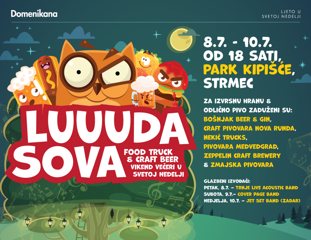 U sklopu manifestacije Domenikana – Ljeto u Svetoj Nedelji ovog vikenda od 08.07. do 10.07.2022. godine u parku Kipišće u Strmcu održat će se Luuuda Sova – Food truck & craft beer vikend u Svetoj Nedelji.