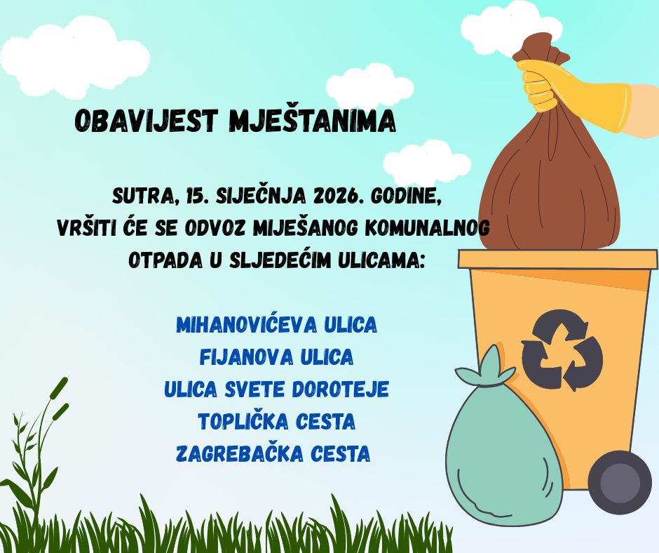 Općina Jakovlje obavještava mještane kako će se odvoz miješanog komunalnog otpada, koji zbog nepredviđenih poteškoća nije bio izvršen u redovitom terminu, provesti sutra, 15. siječnja 2026. godine.